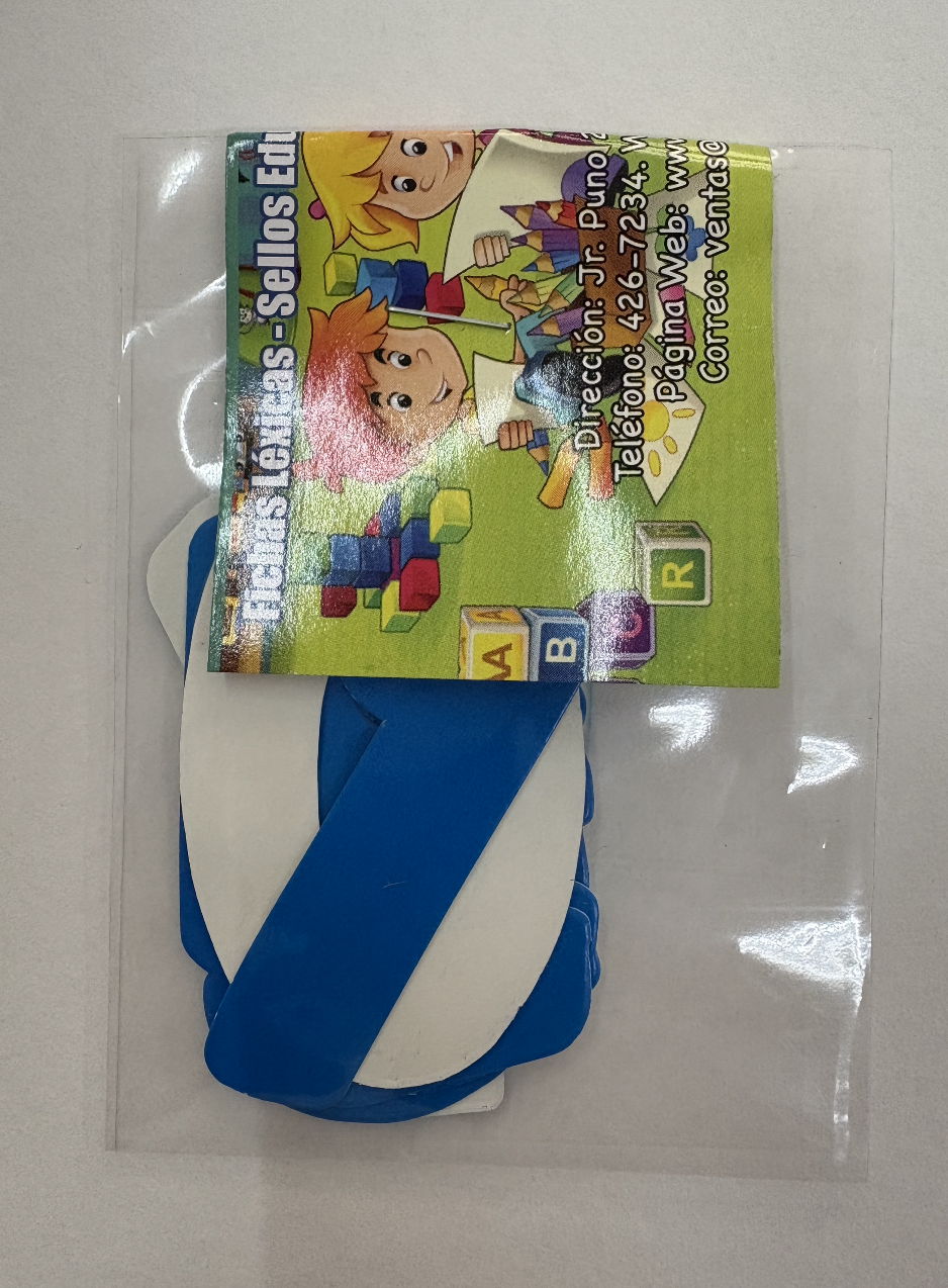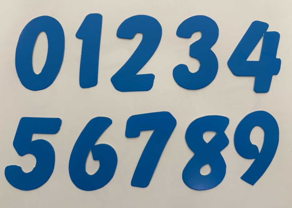 Consiste en los números del 0 al 9 de cartón de 250 grm de tamaño 4.1 cm x 6.2 cm. Se puede usar como molde para hacer nuevos números en otro material o también se les puede usar como decoración.