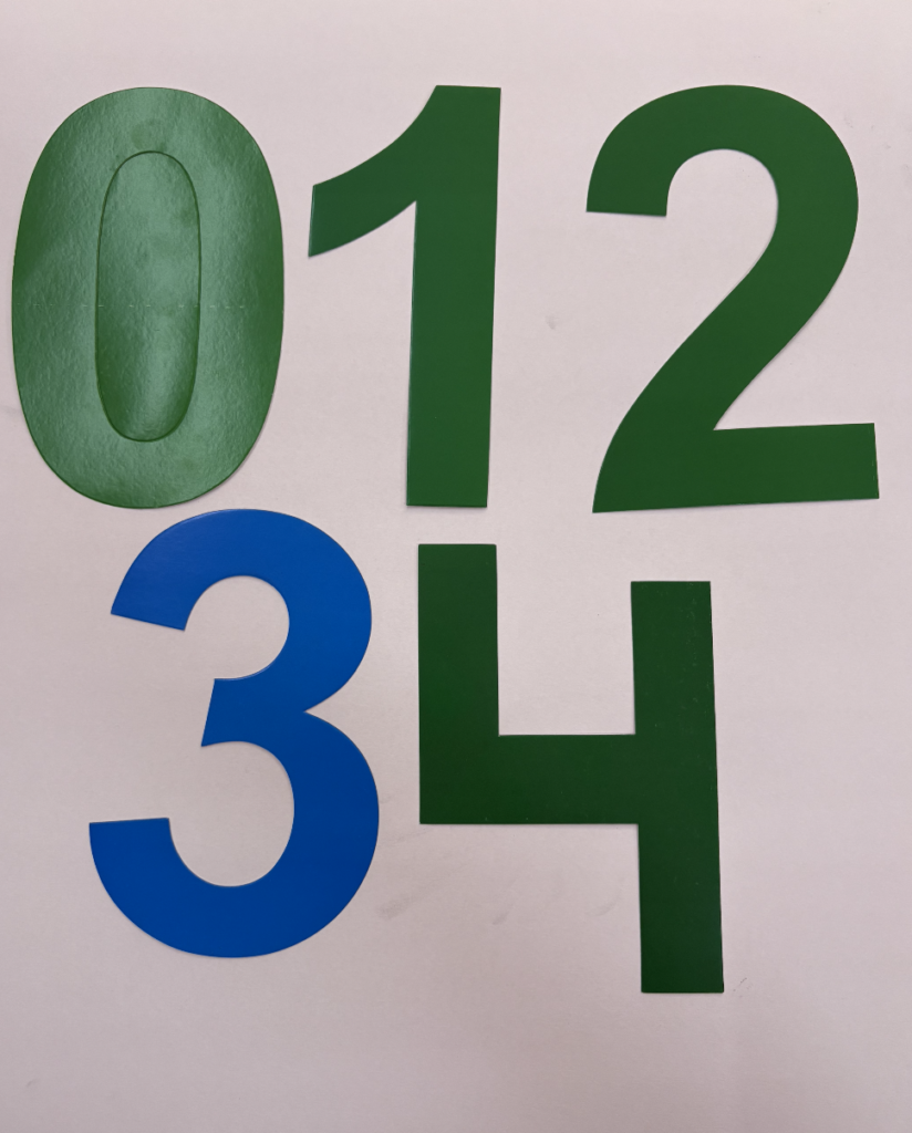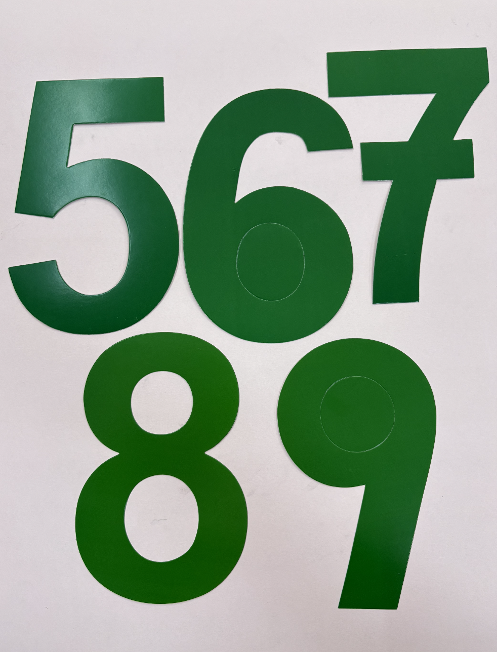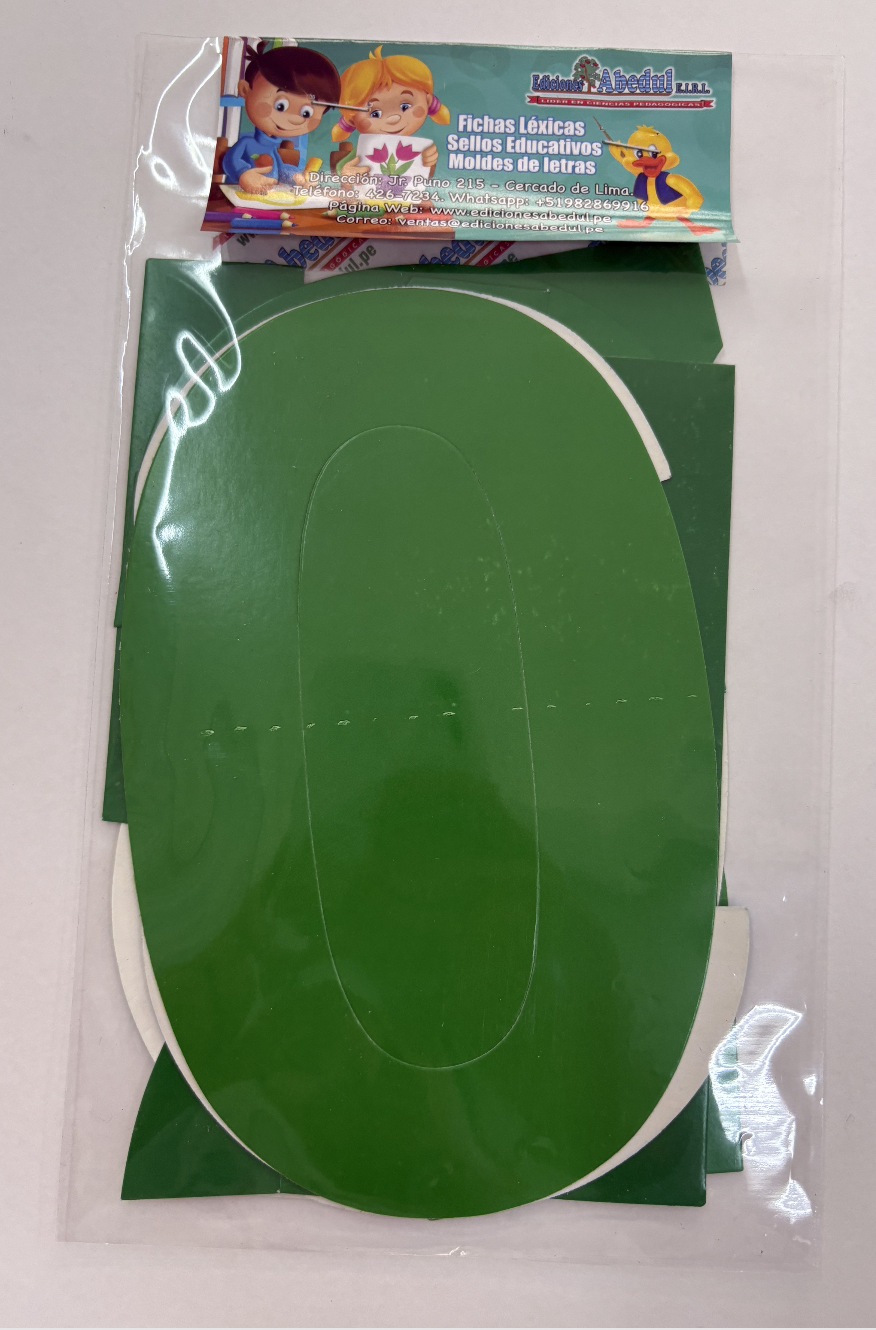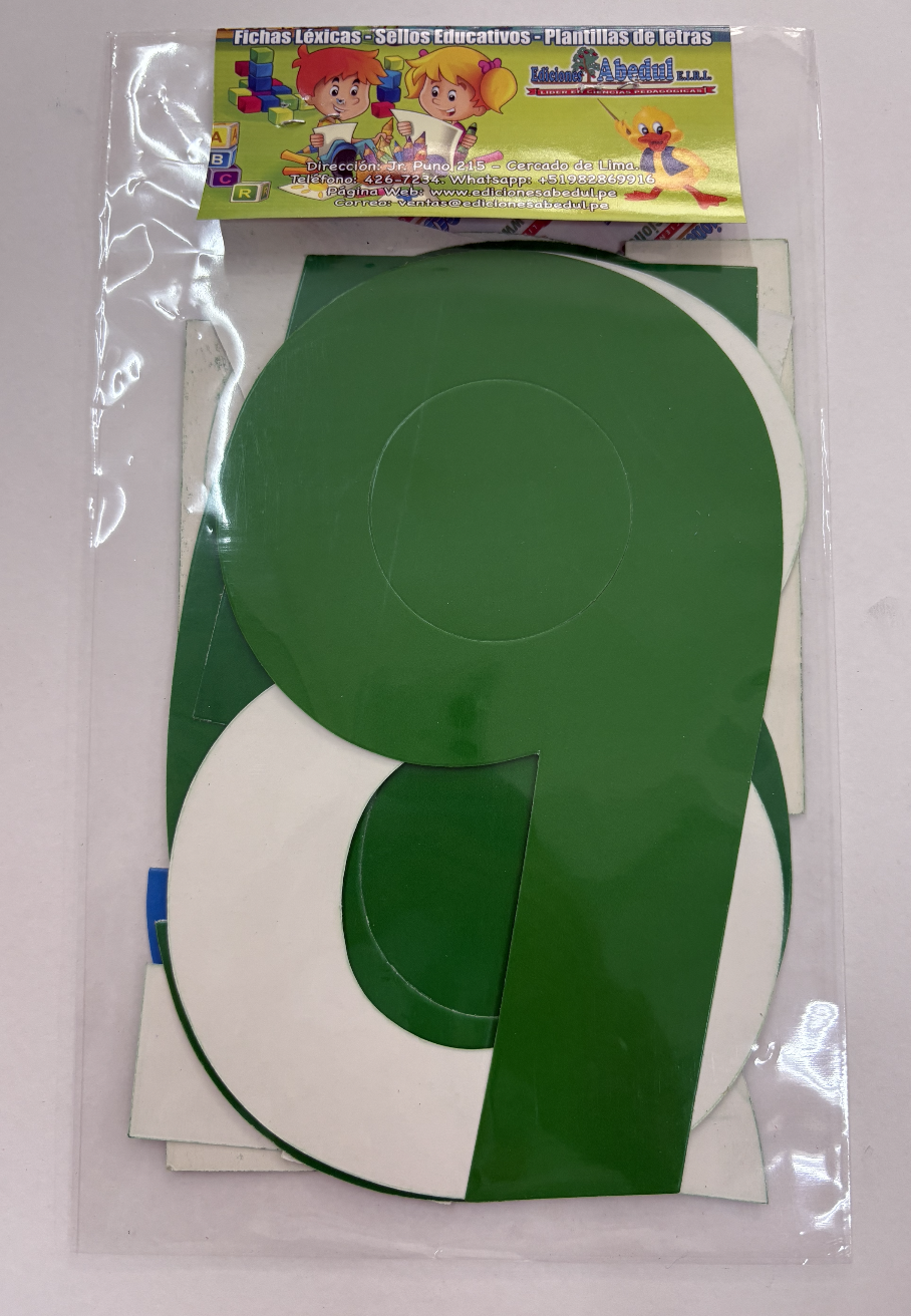 Consiste en los números del 0 al 9 de cartón de 250 grm de tamaño 12.5 cm x 18 cm. Se puede usar como molde para hacer nuevos números en otro material o también se les puede usar como decoración.